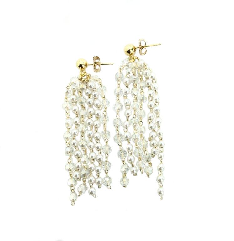 小さなクリスタルとパールがボリューム感たっぷりに下がったピアス。