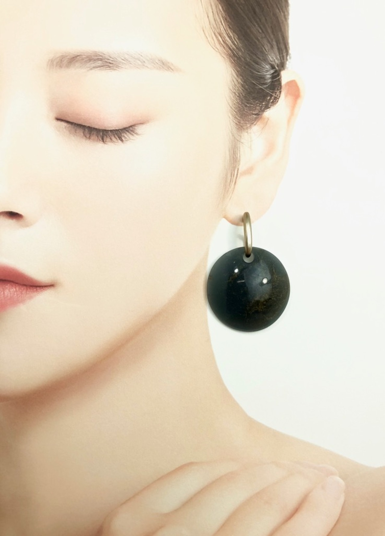 マットな光沢感とラウンドパーツのコントラスがとても上品で動きに合わせて揺れる様は耳元を
