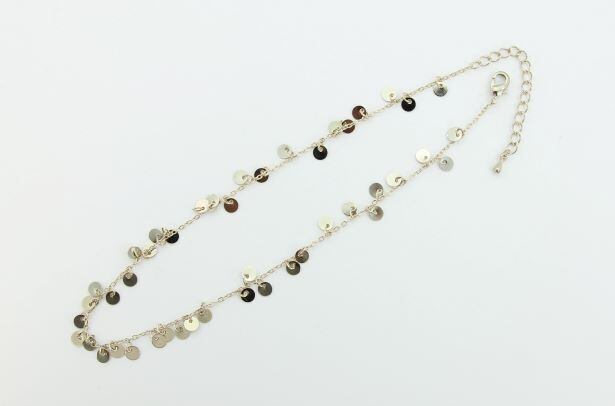 華奢なチェーンに小粒なサークルプレートが下がったショートネックレス
